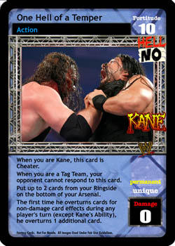 When you are Kane, this card is Cheater. When you are a Tag Team, your opponent cannot respond to this card. Put up to 2 cards from your Ringside on the bottom of your Arsenal. The first time he overturns cards to non-damage effects during any player's turn (except Kane's Ability), he overturns 1 additional card.