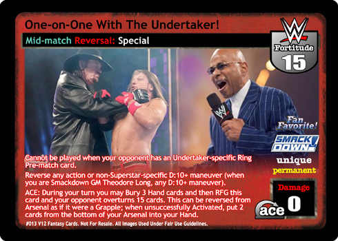 Cannot be played when your opponent has an Undertaker-specific Ring Pre-match card. Reverse any action or non-Superstar-specific D:10+ maneuver (when you are Smackdown GM Theodore Long, any D:10+ maneuver). ACE: During your turn you may Bury 3 Hand cards and then RFG this card and your opponent overturns 15 cards. This can be reversed from Arsenal as if it were a Grapple; when unsuccessfully Activated, put 2 cards from the bottom of your Arsenal into your Hand.