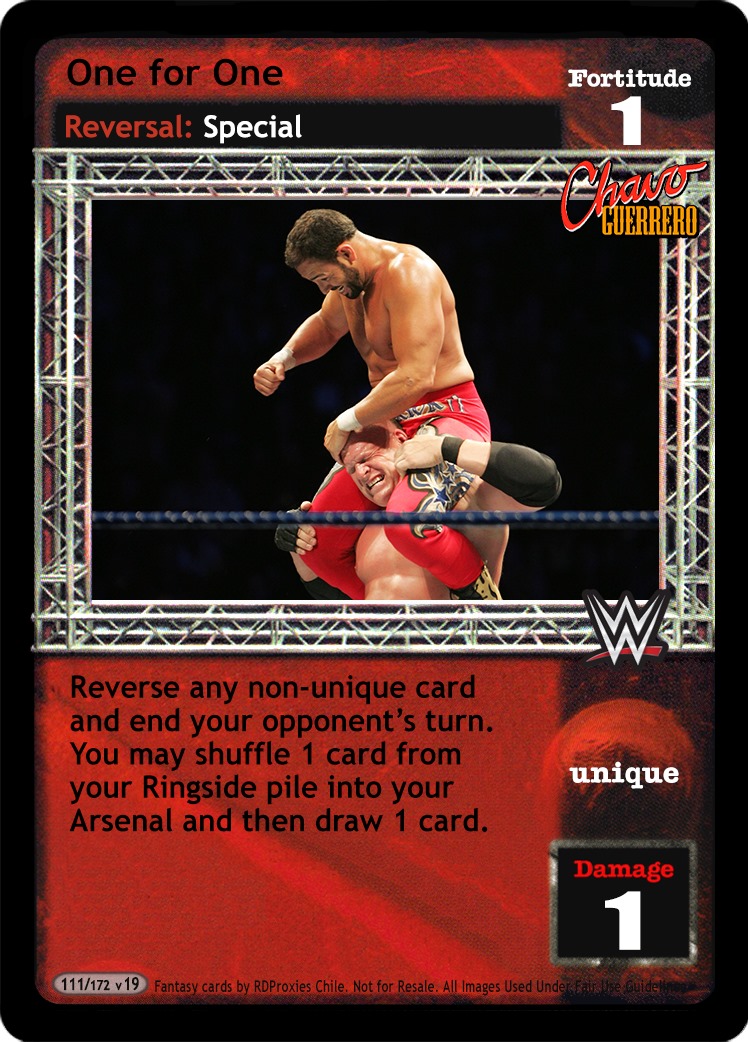 Reverse any non-unique card and end your opponent's turn. You may shuffle 1 card from your Ringside pile into your Arsenal and then draw 1 card.