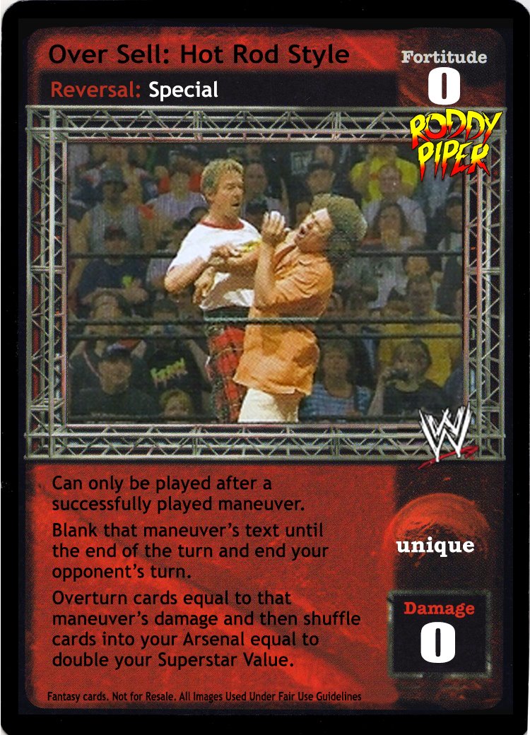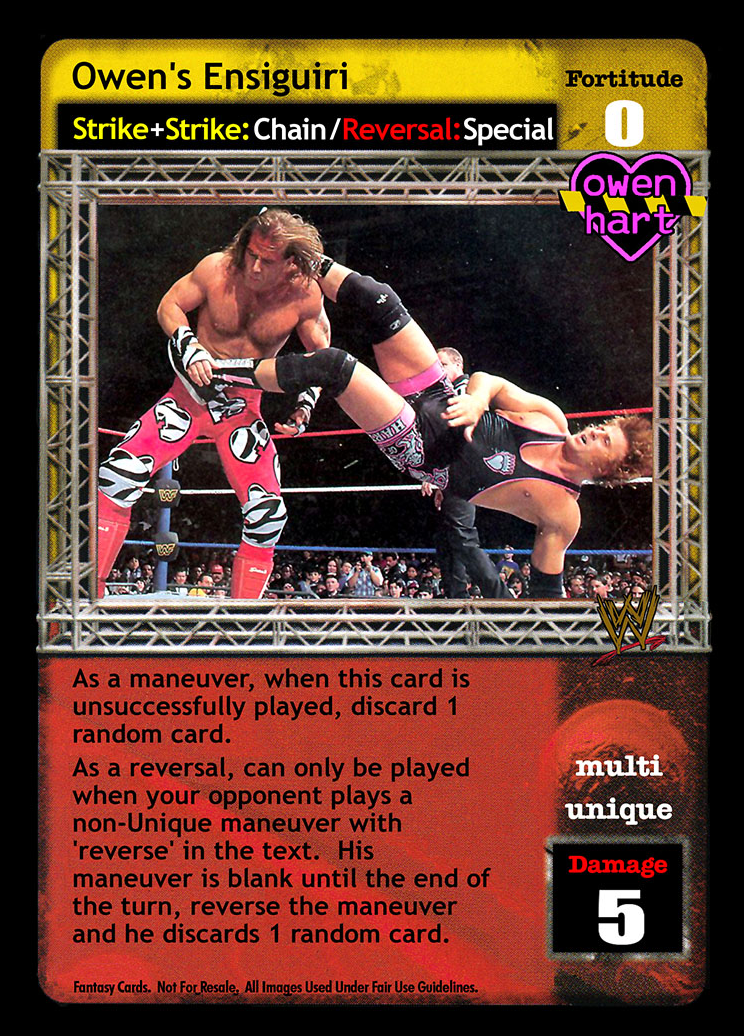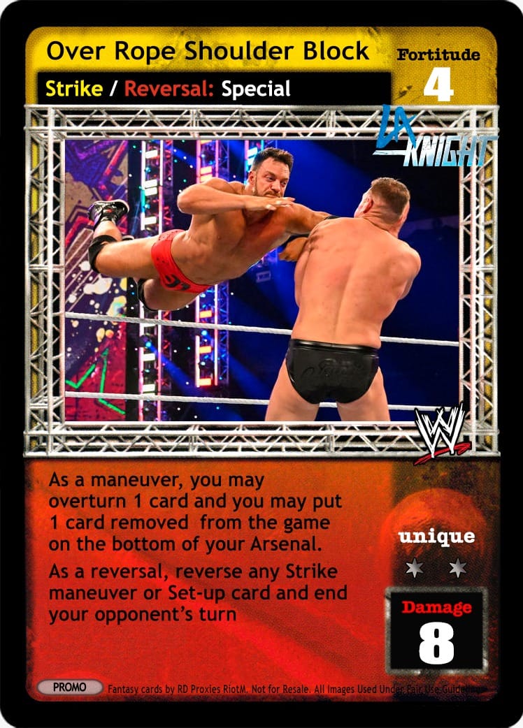 Can only be played after a successfully played maneuver. Blank that maneuver's text until the end of the turn and end your opponent's turn. Overturn cards equal to that maneuver's damage and then shuffle cards into your Arsenal equal to double your Superstar Value.