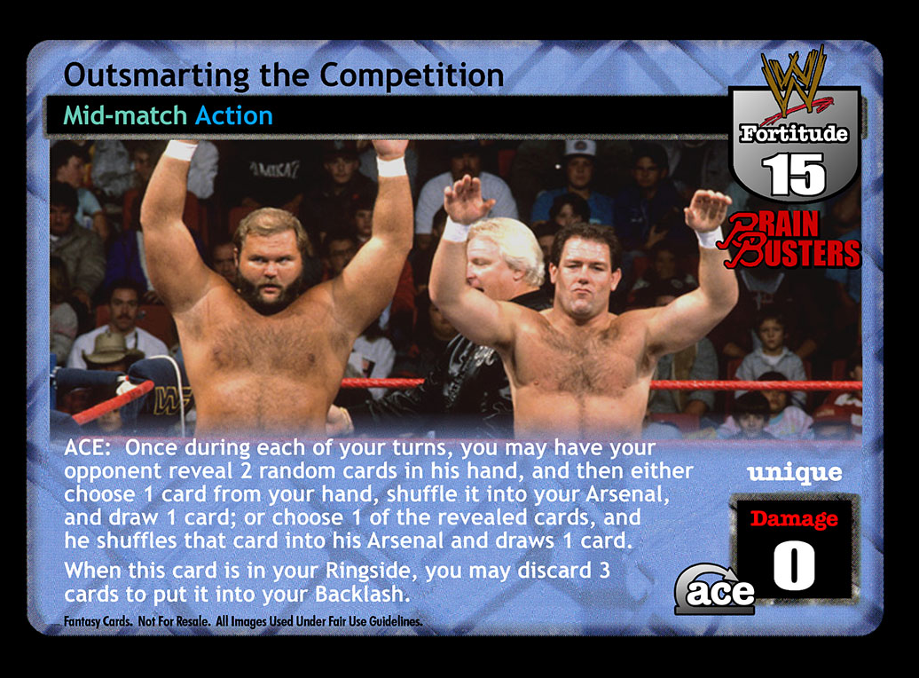 ACE: Once during each of your turns, you may have your opponent reveal 2 random cards in his hand, then either choose 1 card from your hand, shuffle it into your Arsenal, and draw 1 card; or choose 1 of the revealed cards, and he shuffles that card into his Arsenal and draws 1 card. When this card is in your Ringside, you may discard 3 cards to put it into your Backlash.