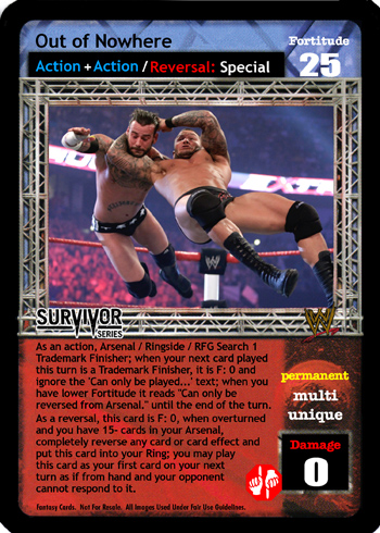 As an action, Arsenal, Ringside, and Removed From Game Search 1 Trademark Finisher; reveal it, put it in your hand, and shuffle. When your next card played this turn is a Trademark Finisher, it is F: 0 and ignore the 'Can only be played...' text, and when you have lower Fortitude it now reads 'Can only be reversed from Arsenal.' until the end of the turn. As a reversal, this card is F: 0, when overturned and you have 15- cards in your Arsenal, completely reverse any card or card effect and put this card in your Ring (regardless of other effects); you may play this card as your first card on your next turn as if from hand and your opponent cannot respond to it.