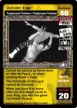 Cannot be packed by Kevin Nash or nWo Wolfpack, or when packing Razor's Edge. The Fortitude of this card cannot be lowered. When you have 8 or more nWo non-Pre-match cards in your Ring, you win the game via Pinfall Victory.