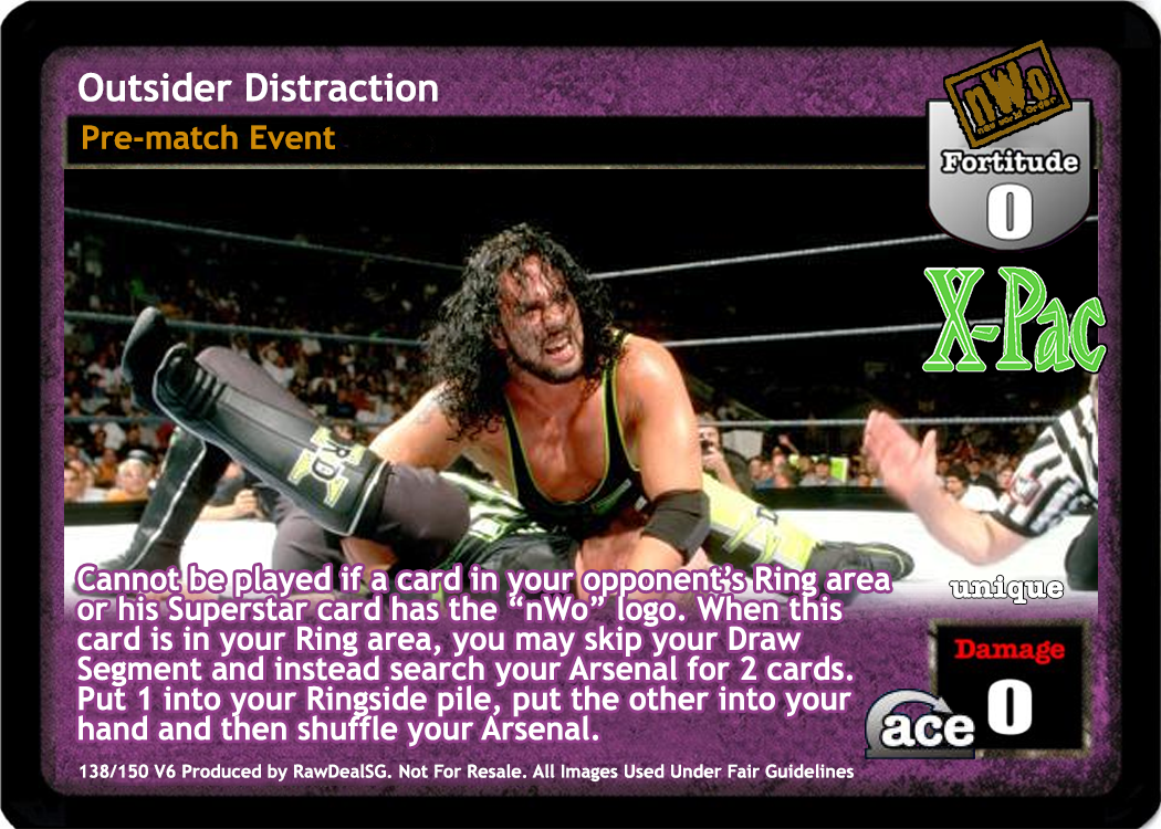 Cannot be played if a card in your opponent's Ring area or his Superstar card has the "nWo" logo. When this card is in your Ring area, you may skip your Draw Segment and instead search your Arsenal for 2 cards, put 1 into your hand, put the other into your Ringside pile, and then shuffle your Arsenal. nWo logo