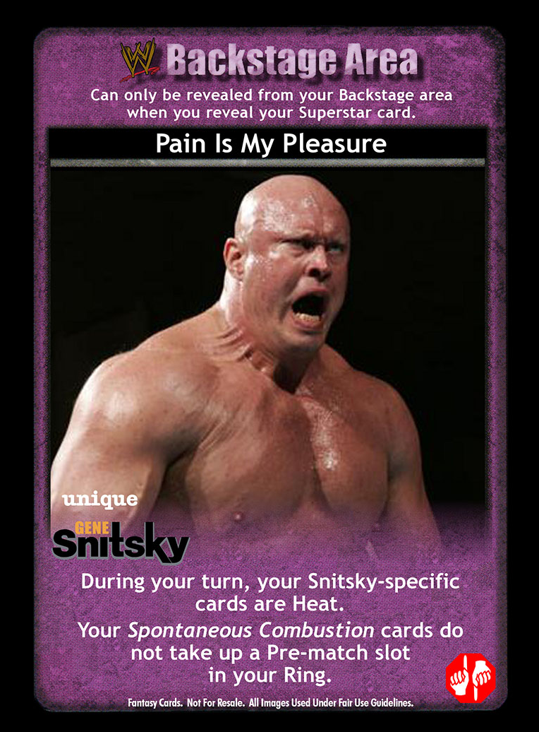 During each of your turns, your Snitsky-specific cards are Heat. Your Spontaneous Combustion cards do not take up a Pre-match slot in your Ring.