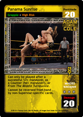 Can only be played after a successful 5D+ maneuver, as a Counter (5D+ maneuver), or From The Middle Turnbuckle. Cannot be reversed from hand by non-Superstar-specific cards.