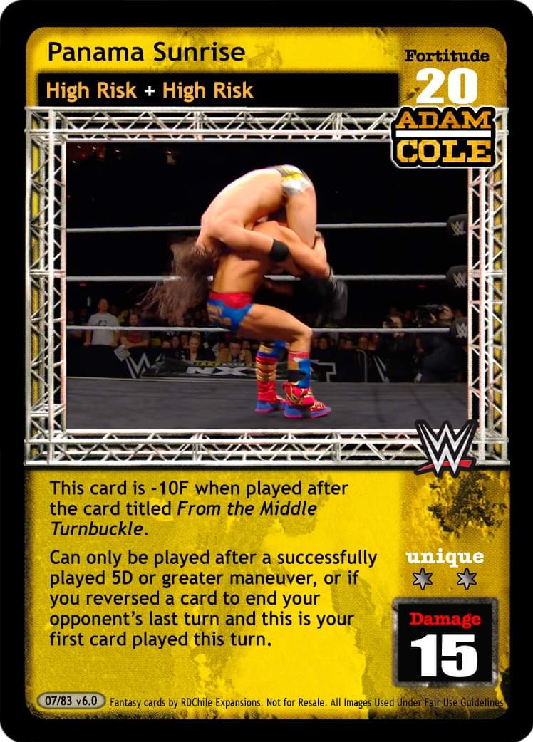 This card is -10F when played after the card title “From the Middle Turnbuckle”. Can only be played after a successfully played 5D or greater maneuver, or if you reversed a card to end your opponent`s last turn and this is your first card played this turn.