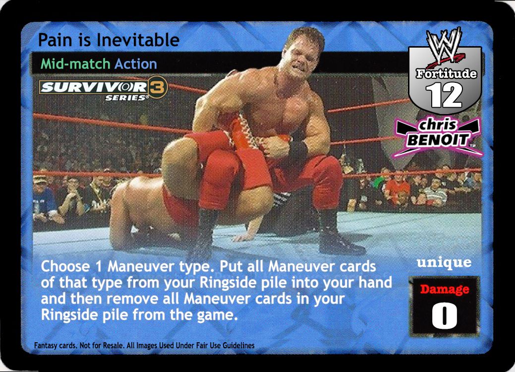 When played by Chris Benoit, this card is -12F. Choose 1 Maneuver type. Put all Maneuver cards of that type from your Ringside pile into your hand and then remove all Maneuver cards in your Ringside pile from the game.