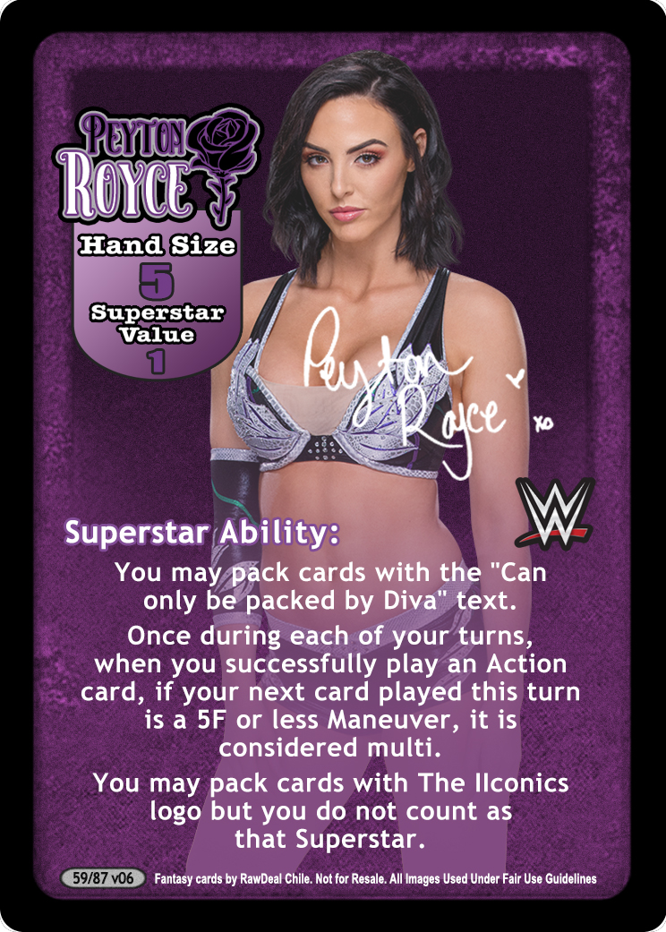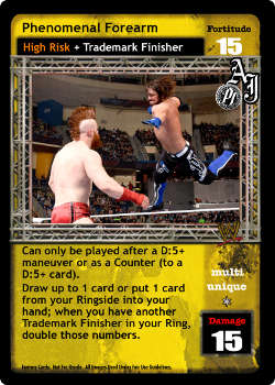 Can only be played after a D:5+ maneuver or as a Counter (to a D:5+ card). Draw up to 1 card or put 1 card from your Ringside into your hand; when you have another Trademark Finisher in your Ring, double those numbers.