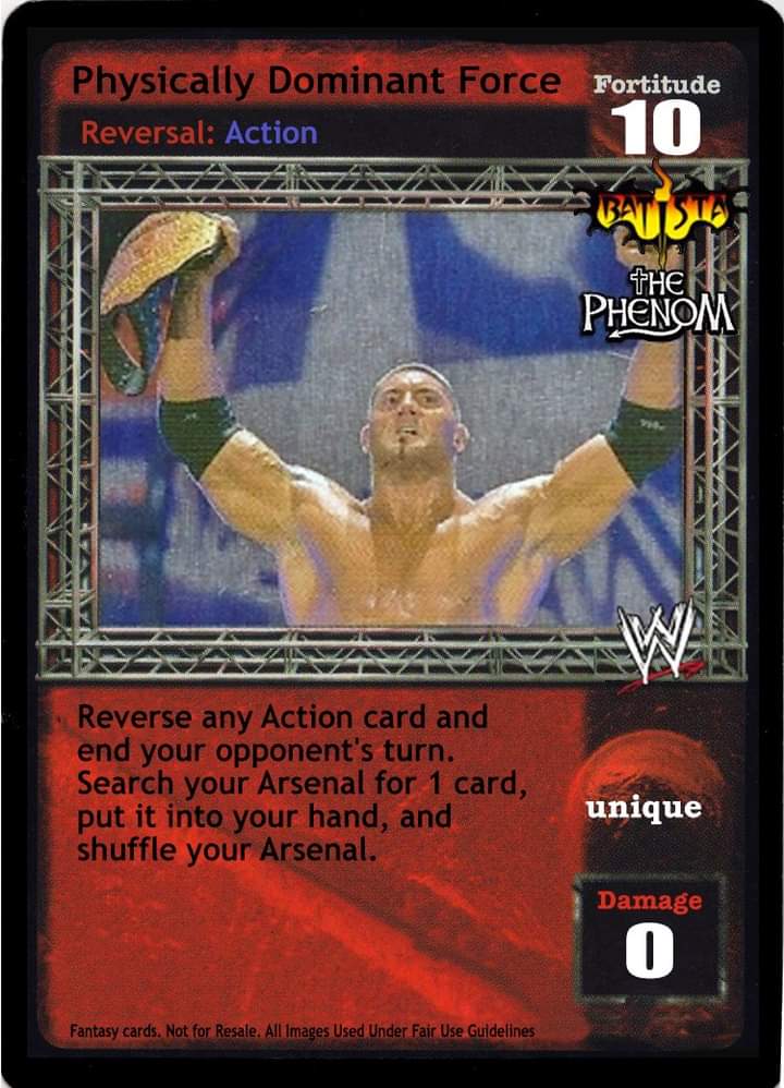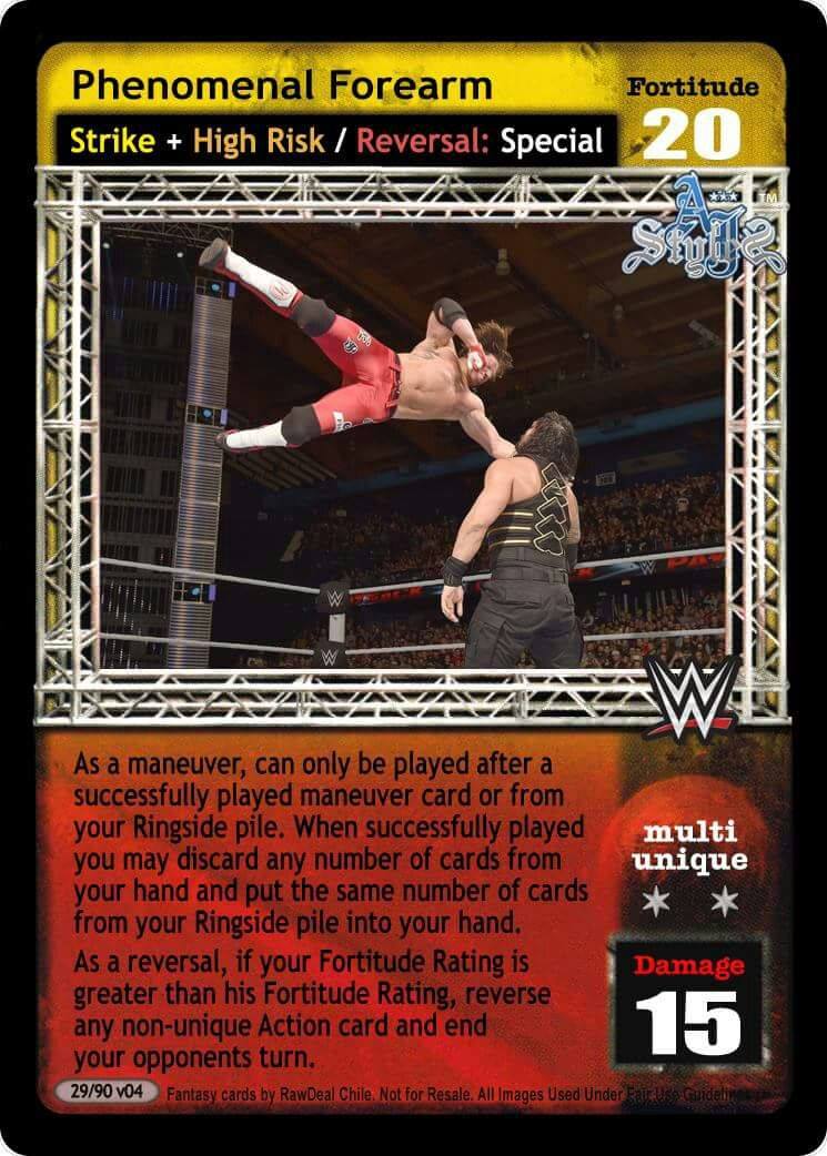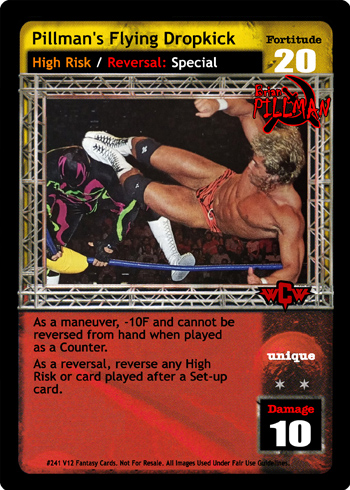 As a maneuver, can only be played after a successfully played maneuver card or from your Ringside pile. When successfully played you may discard any number of cards from your hand and put the same number of cards from your Ringside pile into your hand. As a reversal, if your Fortitude Rating is greater than his Fortitude Rating, reverse any non-unique Action card and end your opponents turn.