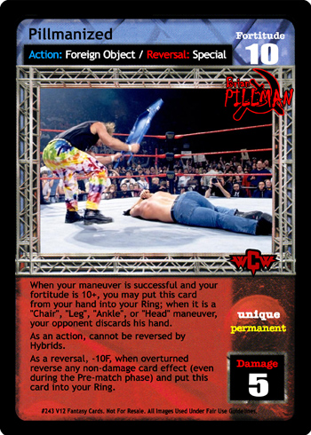 When your maneuver is successful and you have 10+ Fortitude, you may put this card from your hand into your Ring; when it is a 'Chair', 'Leg', 'Ankle', or 'Head' maneuver, your opponent discards his hand. As an action, cannot be reversed by hybrid cards. As a reversal, -10F, when overturned reverse any non-Damage card effect (even during the Pre-match phase) and put this card into your Ring.