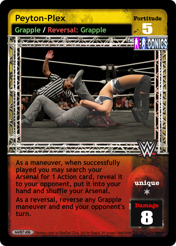 As a maneuver, when successfully played you may search your Arsenal for 1 Action card, reveal it to your opponent, put it into your hand and shuffle your Arsenal. As a Reversal, reverse any Grapple maneuver and end your opponent's turn.