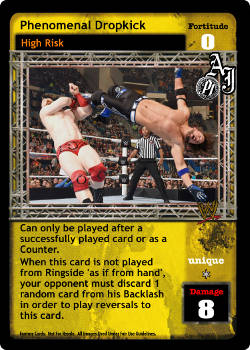 Can only be played after a successfully played card or as a Counter. When this card is not played from Ringside 'as if from hand', your opponent must discard 1 random card from his Backlash in order to play reversals to this card.