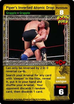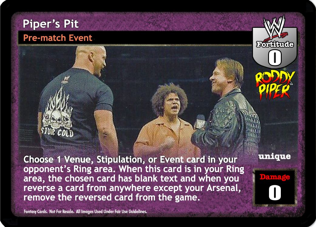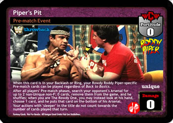 When this card is in your Backlash or Ring, your Rowdy Roddy Piper-specific Pre-match cards can be played regardless of Back to Basics. After all players' Pre-match phases, search your opponent's Arsenal for up to 2 non-Unique non-F: 0 cards, remove them from the game, and he shuffles; when you are the Rowdy One, you may instead look at his hand, choose 1 card, and he puts that card on the bottom of his Arsenal. Your actions with 'sleeper' in the title do not count towards the number of cards played that turn.
