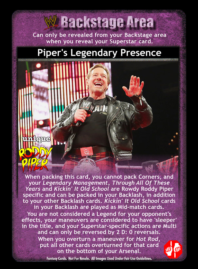 When packing this card, you cannot pack Corners, and your Legendary Management, Through All Of These Years and Kickin' It Old School are Rowdy Roddy Piper-specific and can be packed in your Backlash, in addition to your other Backlash cards. Kickin' It Old School cards in your Backlash are played as Mid-match cards. You are not considered a Legend for your opponent's effects, your maneuvers are considered to have 'sleeper' in the title, and your Superstar-specific actions are Multi and can only be reversed by 2 D: 0 reversals. When you overturn a maneuver for Hot Rod, put all other cards overturned for that card on the bottom of your Arsenal.