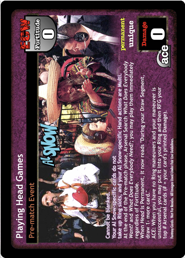 Cannot be blanked. Your Al Snow-specific cards do not take up a Pre-match slot in your Ring, and your Al Snow-specific actions played from hand are Multi. At the end of the Pre-match phase, search your Arsenal and hand for What Does Everybody Want? and What Does Everybody Need?, shuffle, and you may immediately play them regardless of Fortitude. When Head is Permanent, it now reads 'During your Draw Segment, draw up to 1 additional card.' ACE: When your Fortitude Rating is 5- and your maneuver is unsuccessful, you may put that maneuver into your Ring and then remove the top # cards of your Arsenal from the game, where # is the maneuver's printed Damage.