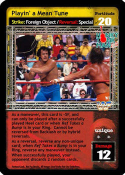 As a maneuver, this card is -5F, and can only be played after a successfully played Heel card or when Ref Takes a Bump is in your Ring. Cannot be reversed from Backlash or by hybrid reversals. As a reversal, reverse any non-unique card; when Ref Takes a Bump is in your Ring, reverse any maneuver instead. When successfully played, your opponent discards 2 random cards.