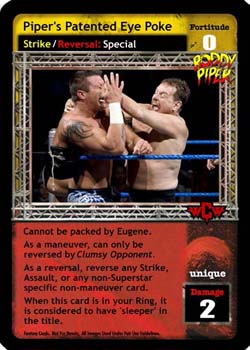 Cannot be packed by Eugene. As a maneuver, can only be reversed by Clumsy Opponent. As a reversal, reverse any Strike, Assault, or any non-Superstar specific non-maneuver card. When this card is in your Ring, it is considered to have 'sleeper' in the title.