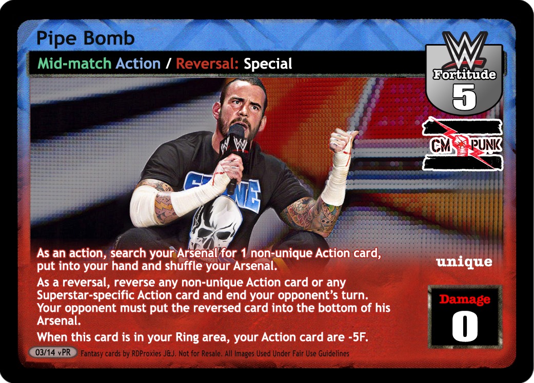 As an action, search your arsenal for 1 non-unique action card put it into your hand and shuffle your arsenal. As a reversal, reverse any non-unique action card or any superstar-specific action card and end your opponent`s turn. Your opponent must put the reversed card into the bottom of his arsenal. When this card is in your ring area, your action cards are -5F.