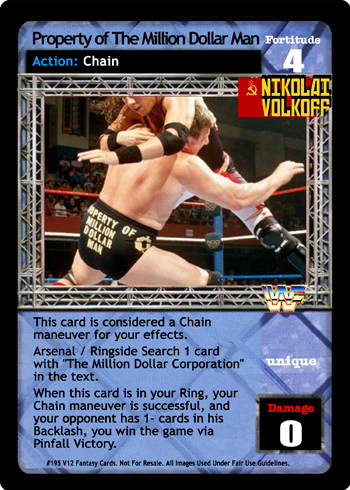 This card is considered a Chain maneuver for your effects. Arsenal and Ringside Search 1 card with 'The Million Dollar Corporation' in the text. When this card is in your Ring, your Chain maneuver is successful, and your opponent has 1- cards in his Backlash, you win the game via Pinfall Victory.