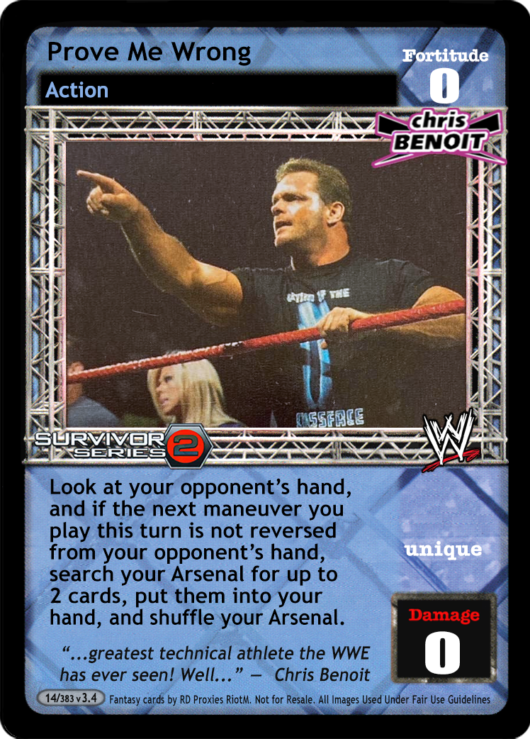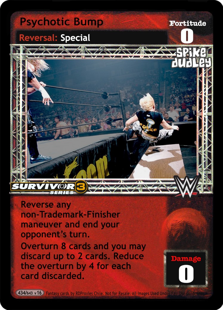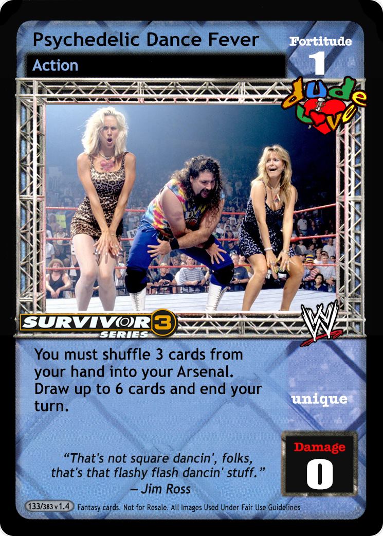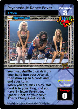 You must shuffle 3 cards from your hand into your Arsenal, then draw up to 6 cards and end your turn. When you are Mick Foley, this card is in your Ring, and you have 5+ lower Fortitude, ignore 'Heel' on your Hey! That's Cheap Heat! cards.