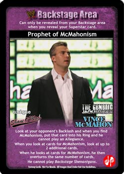 Look at your opponent's Backlash, when you find McMahonism, put that card into his Ring and he cannot play an Allegiance. When you look at cards for McMahonism, look at up to 2 additional cards. When he looks at cards for McMahonism, he then overturns the same number of cards. He cannot play Backstage Shenanigans.
