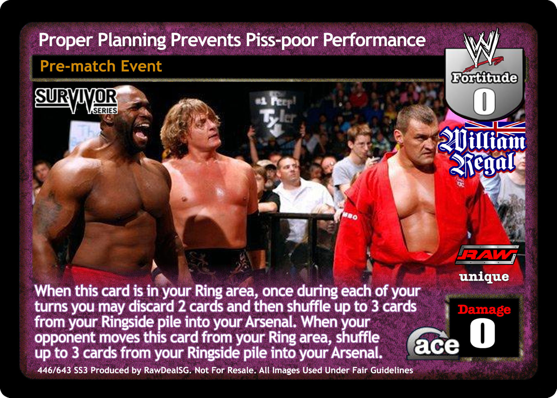 When this card is in your Ring area, once during each of your turns you may discard 2 cards and then shuffle up to 3 cards from your Ringside pile into your Arsenal. If an effect your opponent controls removes this card from your Ring area, you may shuffle up to 3 cards from your Ringside pile into your Arsenal.
