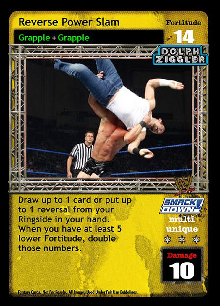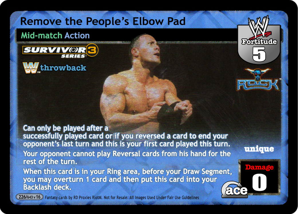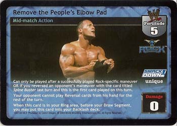 Can only be played after a successfully played Rock-specific maneuver OR if you reversed an opponent's maneuver with the card titled Spine Buster last turn and this is the first card played on this turn. Your opponent cannot play Reversal cards from his hand for the rest of the turn. When this card is in your Ring area, before your Draw Segment, you may put this card into your Backlash deck.
