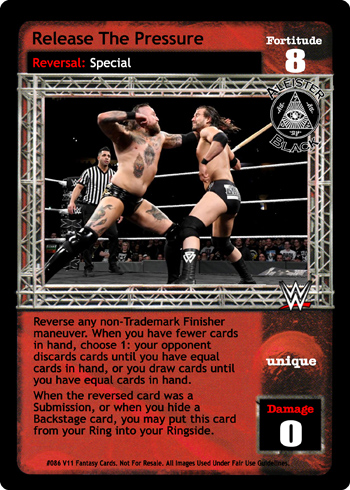 Reverse any non-Trademark Finisher maneuver. When you have fewer cards in hand, choose 1: your opponent discards cards until you have equal cards in hand, or you draw cards until you have equal cards in hand. When the reversed card was a Submission, or when you hide a Backstage card, you may put this card from your Ring into your Ringside.