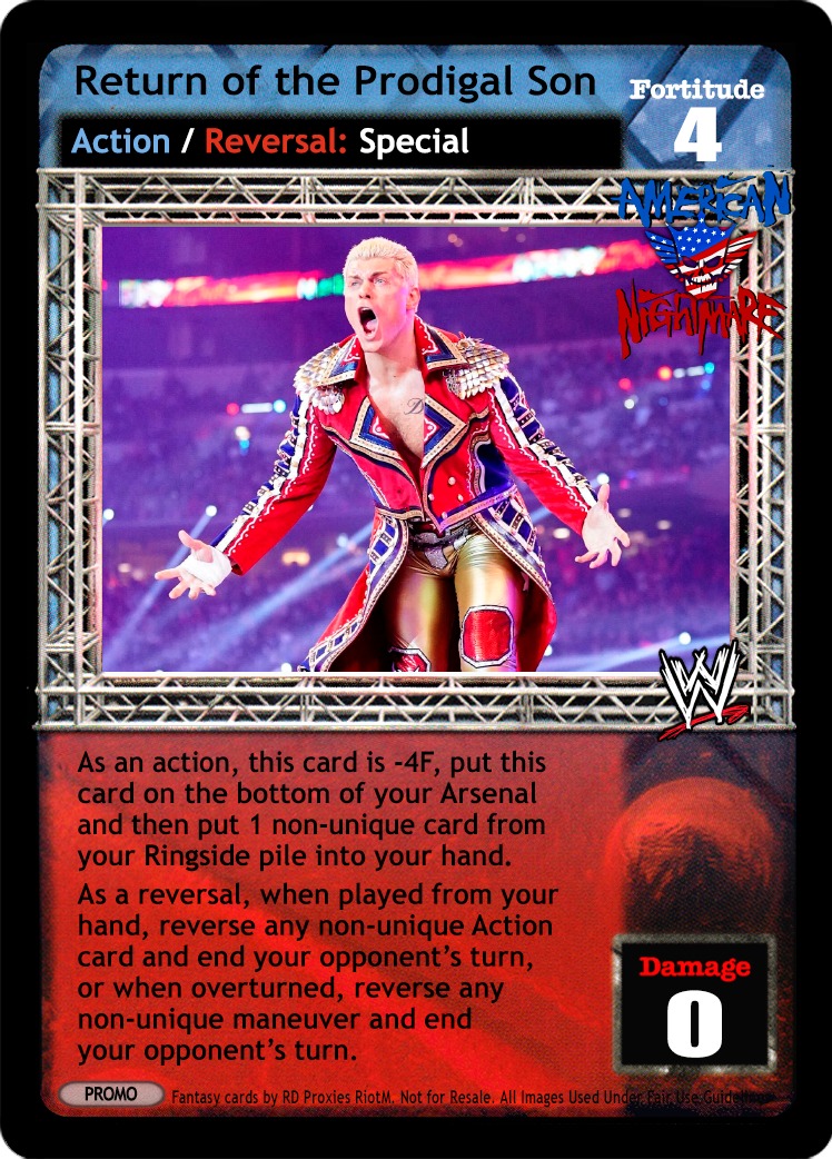 As an action, this card is -4F, ut this card on the bottom of your arsenal and then put 1 non-unique card from your ringside pile into your hand. As a reversal, when played from your hand, reverse any non-unique action card and en your opponents turn, or when overtuned, reverse any non-unique maneuver and end your opponent's turn.
