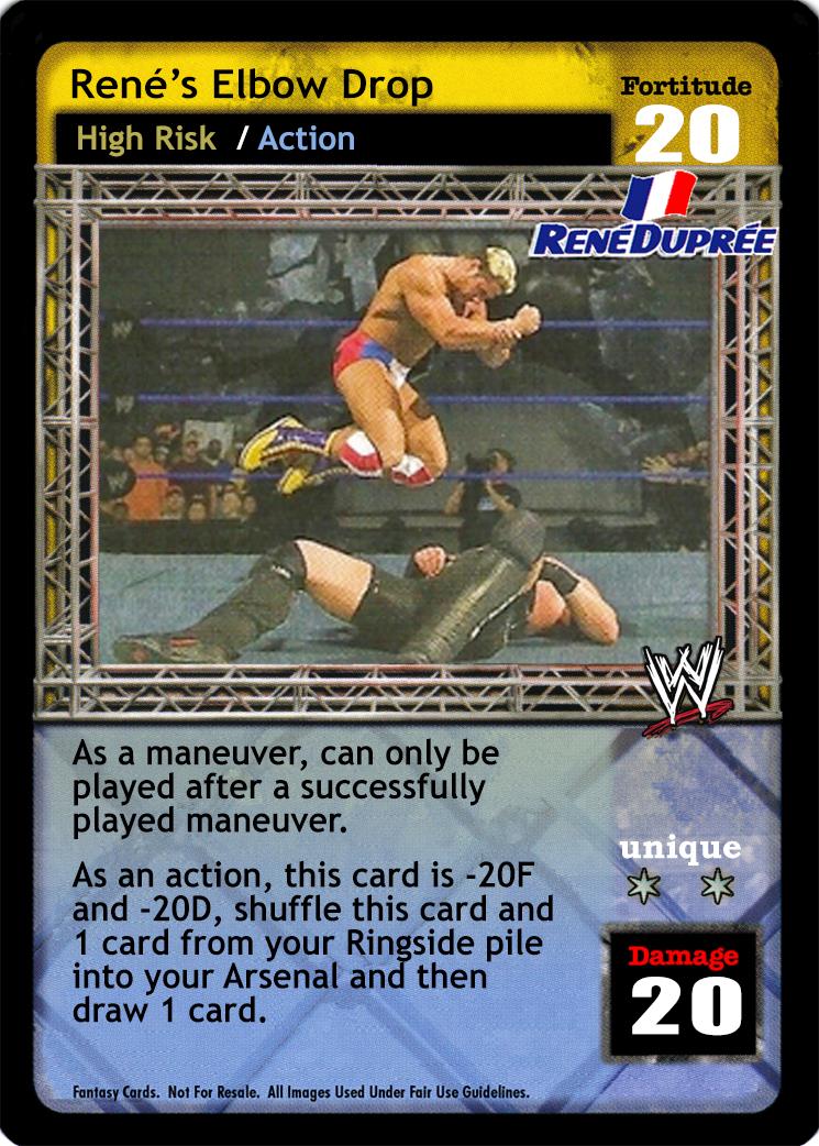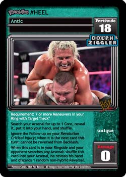 As a maneuver, can only be played after a successfully played maneuver. As an action, this card is -20F and -20D, shuffle this card and 1 card from your Ringside pile into your Arsenal and then draw 1 card.
