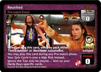 When packing this card, you may pack either That's Suicide! or Mattitude Adjustment. You may play this card during any Pre-match phase. Your Spin Cycle is now a High Risk instead. Ignore the 'Can only be played...' text on your Hardy Boyz-specific cards.