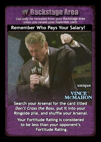 Can only be revealed from your Backstage area when you reveal your Superstar card. Search your Arsenal for the card titled Don't Cross the Boss, put it into your Ringside pile, and shuffle your Arsenal. Your Fortitude Rating is considered to be less than your opponent's Fortitude Rating.