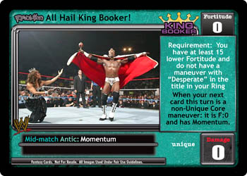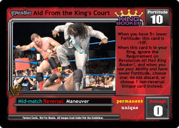 When you have 5+ lower Fortitude, this card is -10F. When this card is in your Ring, ignore the Requirement on Revolution All Hail King Booker!, and when you use your Ability and have lower Fortitude, choose one: do not discard, or choose 1 non-reversal Unique card instead.