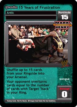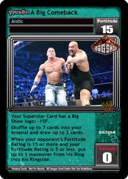 Your Superstar Card has a Big Show logo: -15F. Shuffle up to 7 cards into your Arsenal and draw up to 2 cards. When your opponent's Fortitude Rating is 15 or more and your Fortitude Rating is 5 or less, put up to 1 maneuver from his Ring into his Ringside.