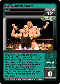 Draw up to 2 cards and put up to 1 card with 'Degenerates' in the text from your Ringside into your hand. You may put 1 non-Unique card from your Ring into your Ringside; if you do, put 1 card in your opponent's Ring with Damage equal to or less than the Damage of the card removed into his Ringside.