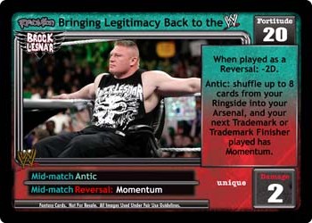 When played as a Reversal: -2D. Antic: shuffle up to 8 cards from your Ringside into your Arsenal. Your next Trademark or Trademark Finisher played has Momentum.