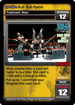 When played after a card with 'table' in the title: this card is +10D and a Colossal instead. Put up to 1 card from your Ringside into your hand.