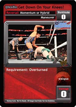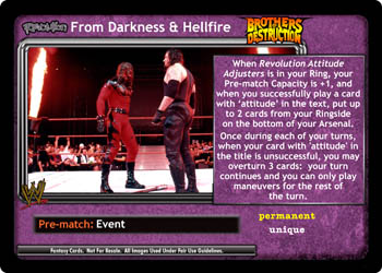 When Revolution Attitude Adjusters is in your Ring, your Pre-match Capacity is +1, and when you successfully play a card with 'attitude' in the text, put up to 2 cards from your Ringside on the bottom of your Arsenal. Once during each of your turns, when your card with 'attitude' in the title is unsuccessful, you may overturn 3 cards and your turn continues; you can only play maneuvers for the remainder of the turn.