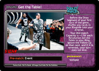 Before the Draw Segment of your first turn of the game, shuffle any cards in your Ringside into your Arsenal. Your Mid-match Capacity is +1 for each Revolution Set the Table in your Ring, ignore the Follow-up on that card, and if it is reversed, your turn does not end.