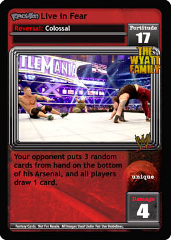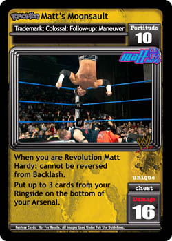 When you are Revolution Matt Hardy: cannot be reversed from Backlash. Put up to 3 cards from your Ringside on the bottom of your Arsenal.
