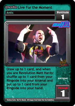 Draw up to 1 card, and when you are Revolution Matt Hardy: shuffle up to 1 card from your Ringside into your Arsenal and put up to 1 card from your Ringside into your hand.