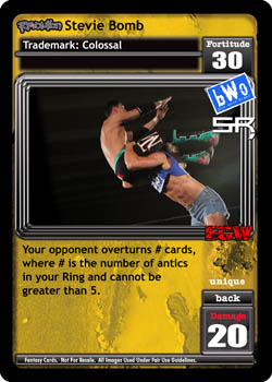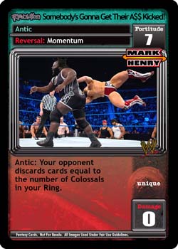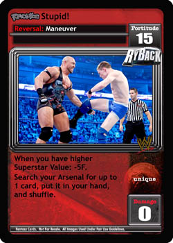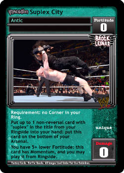 Requirement: no Corner in your Ring. Put up to 1 non-reversal card with 'suplex' in the title from your Ringside into your hand: put this card on the bottom of your Arsenal. You have 5+ lower Fortitude: this card has Momentum, and you may play it from Ringside.