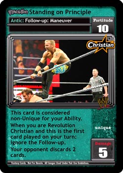 This card is considered non-Unique for your Ability. When you are Revolution Christian and this is the first card played on your turn: ignore the Follow-up. Your opponent discards 2 cards.