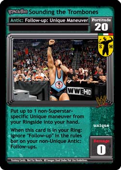 Put up to 1 non-Superstar-specific Unique maneuver from your Ringside into your hand. When this card is in your Ring: ignore 'Follow-up' in the rules bar on your non-Unique Antic: Follow-ups.