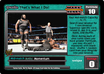 Your Mid-match Capacity is +1. Search your Arsenal for 1 non-reversal Superstar-specific card, reveal it, put it in your hand, and shuffle. Once during each of your turns when you have greater Fortitude, you may discard 1 maneuver with blank text: