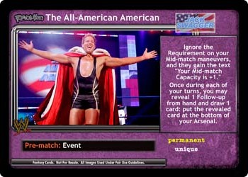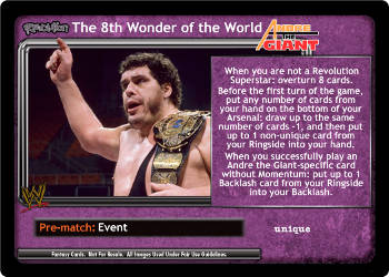 When you are not a Revolution Superstar: overturn 8 cards. Before the first turn of the game, put any number of cards from your hand on the bottom of your Arsenal: draw up to the same number of cards -1 and then put up to 1 non-unique card from your Ringside into your hand. When you successfully play an Andre the Giant-specific card without Momentum: put up to 1 Backlash card from your Ringside into your Backlash.