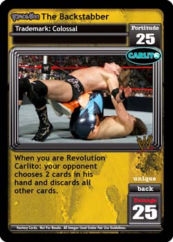 When you are Revolution Carlito: your opponent chooses 2 cards in his hand and discards all other cards.