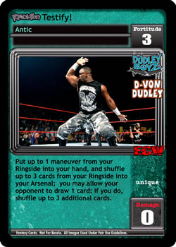 Put up to 1 maneuver from your Ringside into your hand, and shuffle up to 3 cards from your Ringside into your Arsenal; you may allow your opponent to draw 1 card: if you do, shuffle up to 3 additional cards.