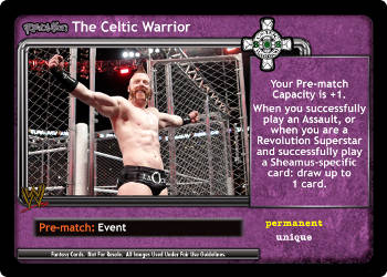 Your Pre-match Capacity is +1. When you successfully play an Assault, or when you are a Revolution Superstar and successfully play a Sheamus-specific card: draw up to 1 card.